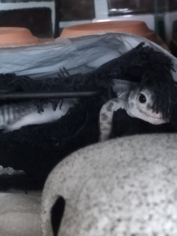 10時過ぎ頃、シェルターonシェルターから出てて来て脱皮開始。シェルターに入ったり出たりしながらデニムの生地にスリスリしてた。よく見たらシェルターの中に小さい皮が落ちてた(写真の左下の方に少しだけ写ってる)ので、すでにどこか剥け始めてたみたい。