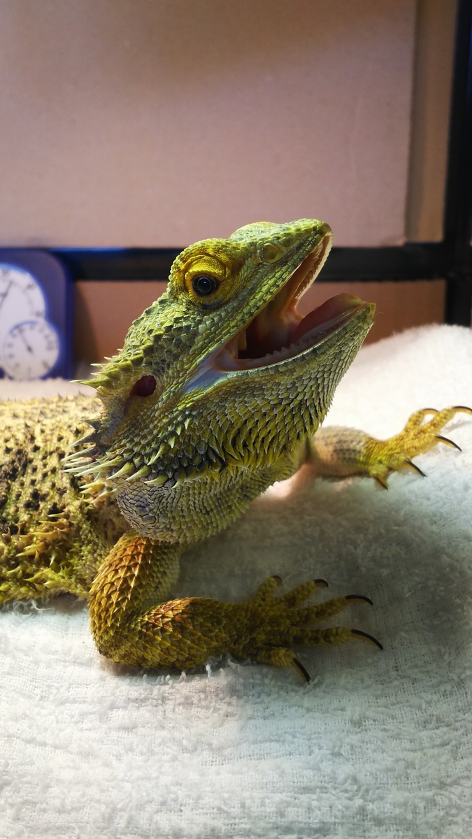 今朝起きて来た時も跳び箱シェルターの中にいた。手に触れたら頭を挙げた。まだ生きてた。